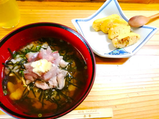 While the sauce was simmering, we made "Magocha" using horse mackerel for lunch on the fourth day. Magocha is a type of Chazuke with horse mackerel as a topping, but this time dashi is used instead of green tea. This time, instead of green tea, dashi was used. This was the second time preparing the horse mackerel, and the students seemed to be getting used to it. At the request of one of the students, they also tried their hand to make a Japanese-style rolled egg omelet.